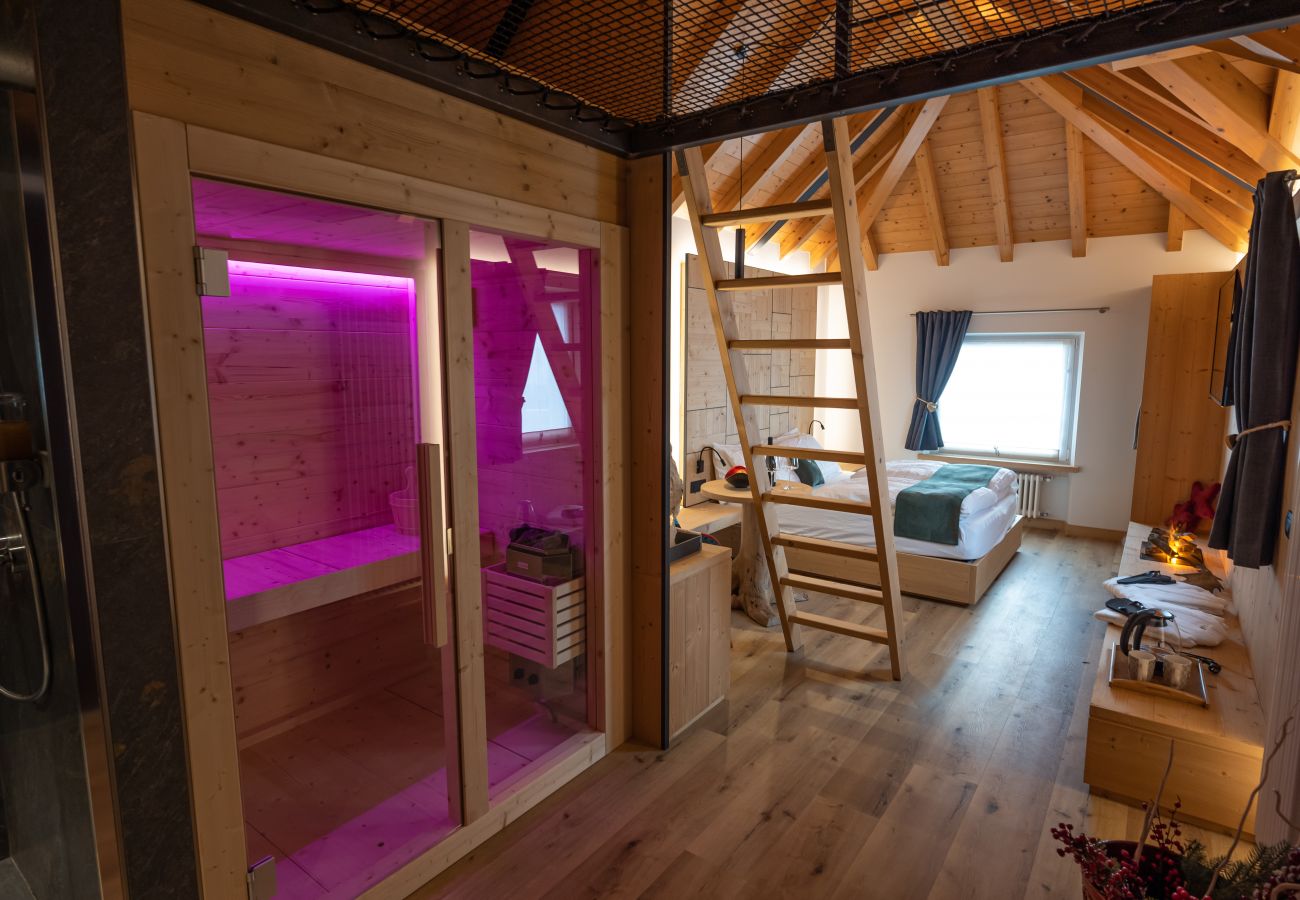 La camera Camoscio è composta da un comodo letto matrimoniale con Tv Lcd e cabina armadio. A disposizione un tavolino con sedie e un caminetto elettrico. La sauna con cromoterapia è ampia e confortevole. Il bagno è dotato di wc. bidet e ampio box doccia. A disposizione come zona relax un soppalco con una grande rete dove stare comodamente sdraiati. All’esterno una bellissima e ampia terrazza con grande vasca idromassaggio riscaldata con cromoterapia e un caminetto con panca per autentici momenti di benessere e romanticismo all’aria aperta e illuminati dal chiarore delle stelle. Possibilità di fare la prima colazione nel ristorante sottostante. A disposizione il collegamento internet Wi-fi e il parcheggio auto nel piazzale esterno. La camera è ideale per una coppia in cerca di relax e benessere in un ambiente ricercato e romantico.
