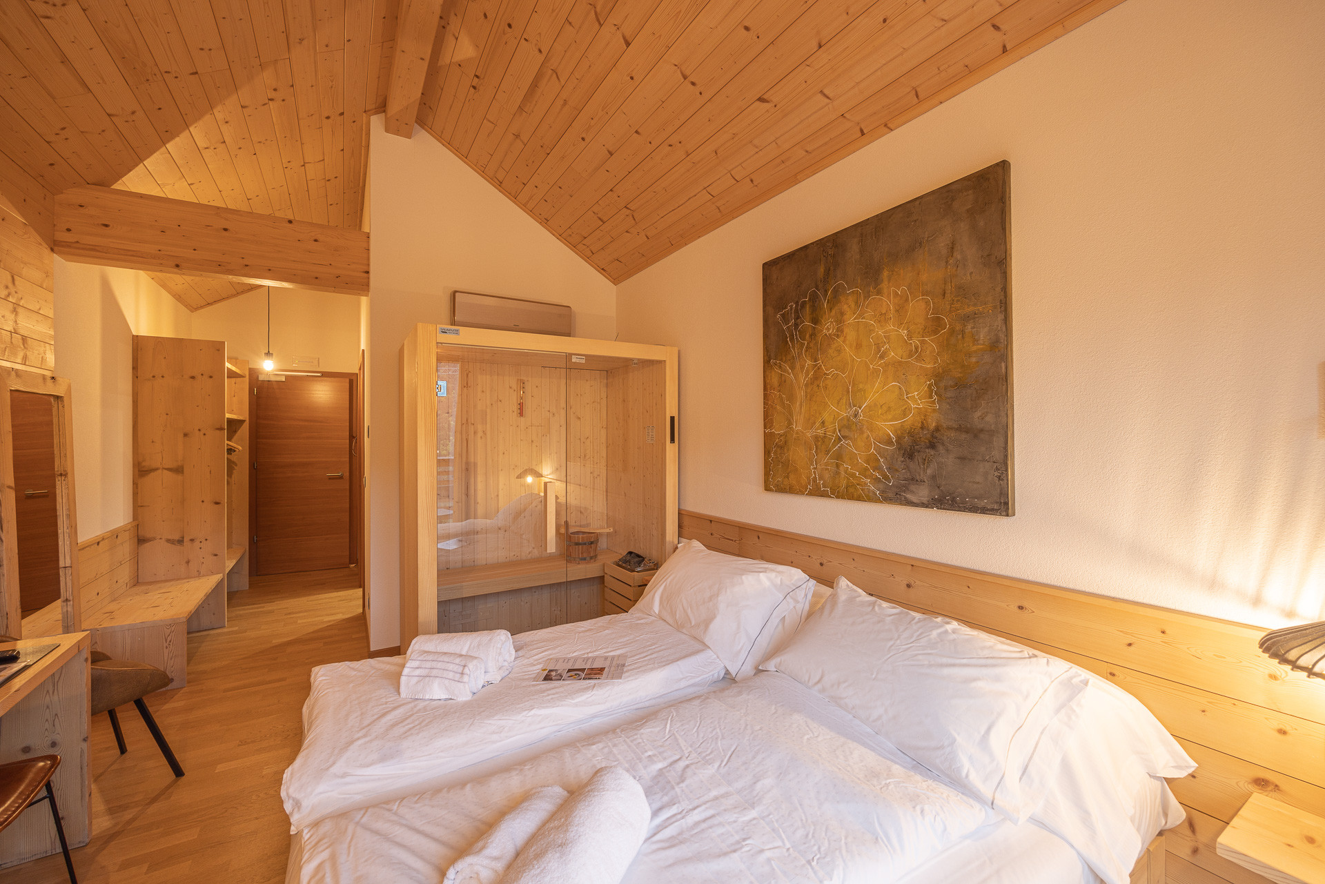 La camera wellness misura 20 mq e si trova al primo piano e dispone di un comodo letto matrimoniale, una sauna e una vasca idromassaggio ad uso esclusivo, un armadio, una TV a schermo piatto, un frigo e un balcone panoramico vista lago e montagne. La camera ha un bagno privato con WC, bidet, box doccia e asciugacapelli. A disposizione la connessione Wi-Fi gratuita, un condizionatore e un posto auto nel parcheggio esterno. Compresa nel prezzo la prima colazione servita nella panoramica zona bar.