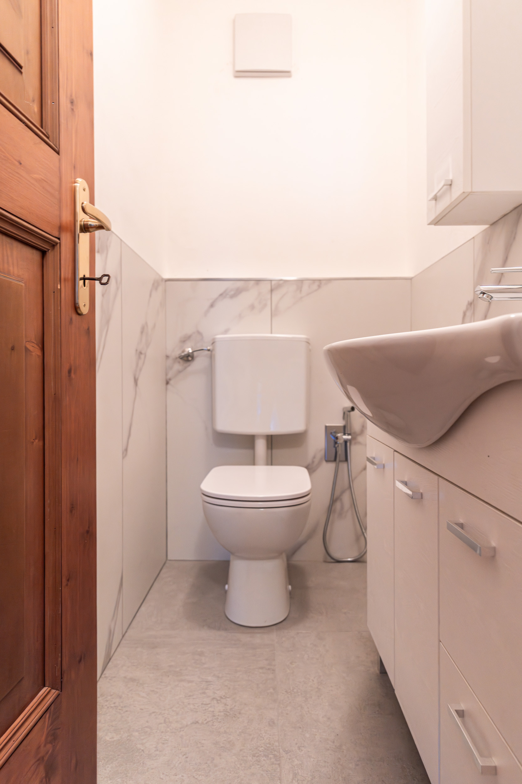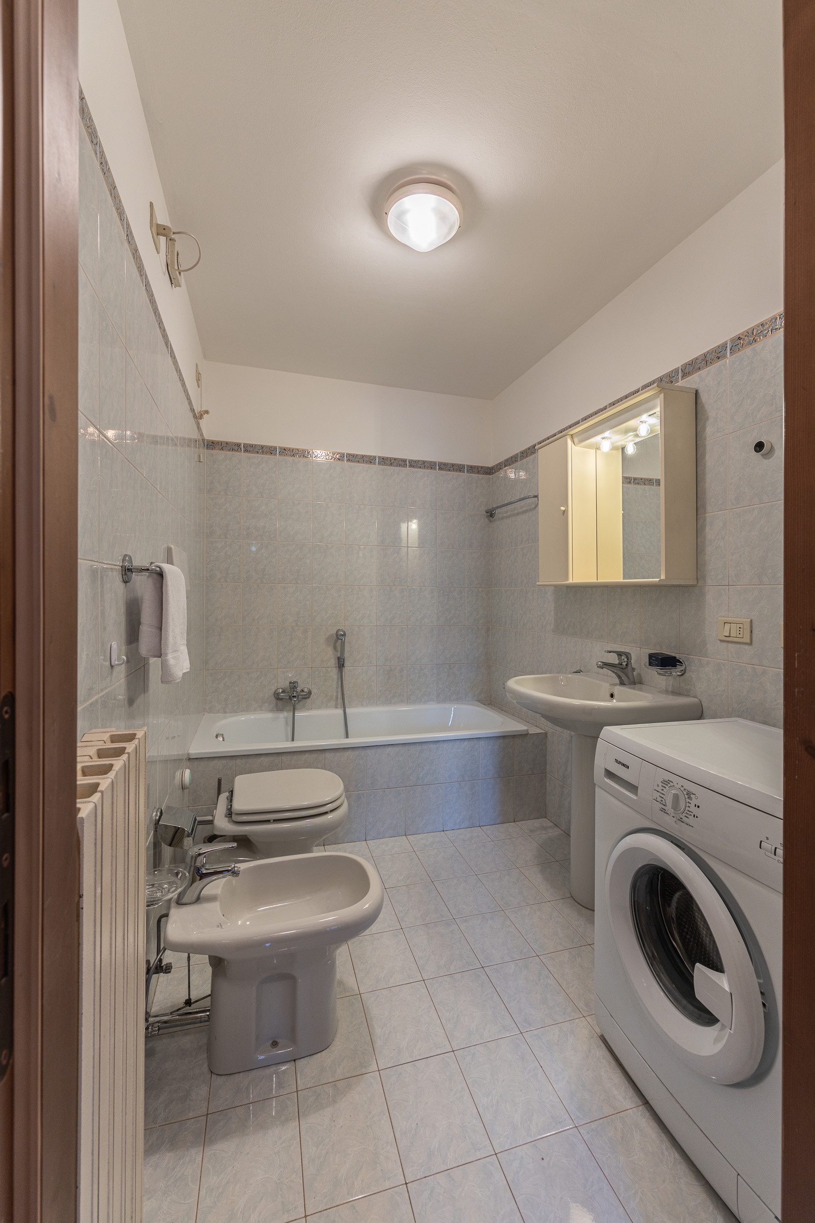 Sono presenti due bagni: uno di servizio con WC e lavabo e l’altro completo di WC, bidet e vasca da bagno.