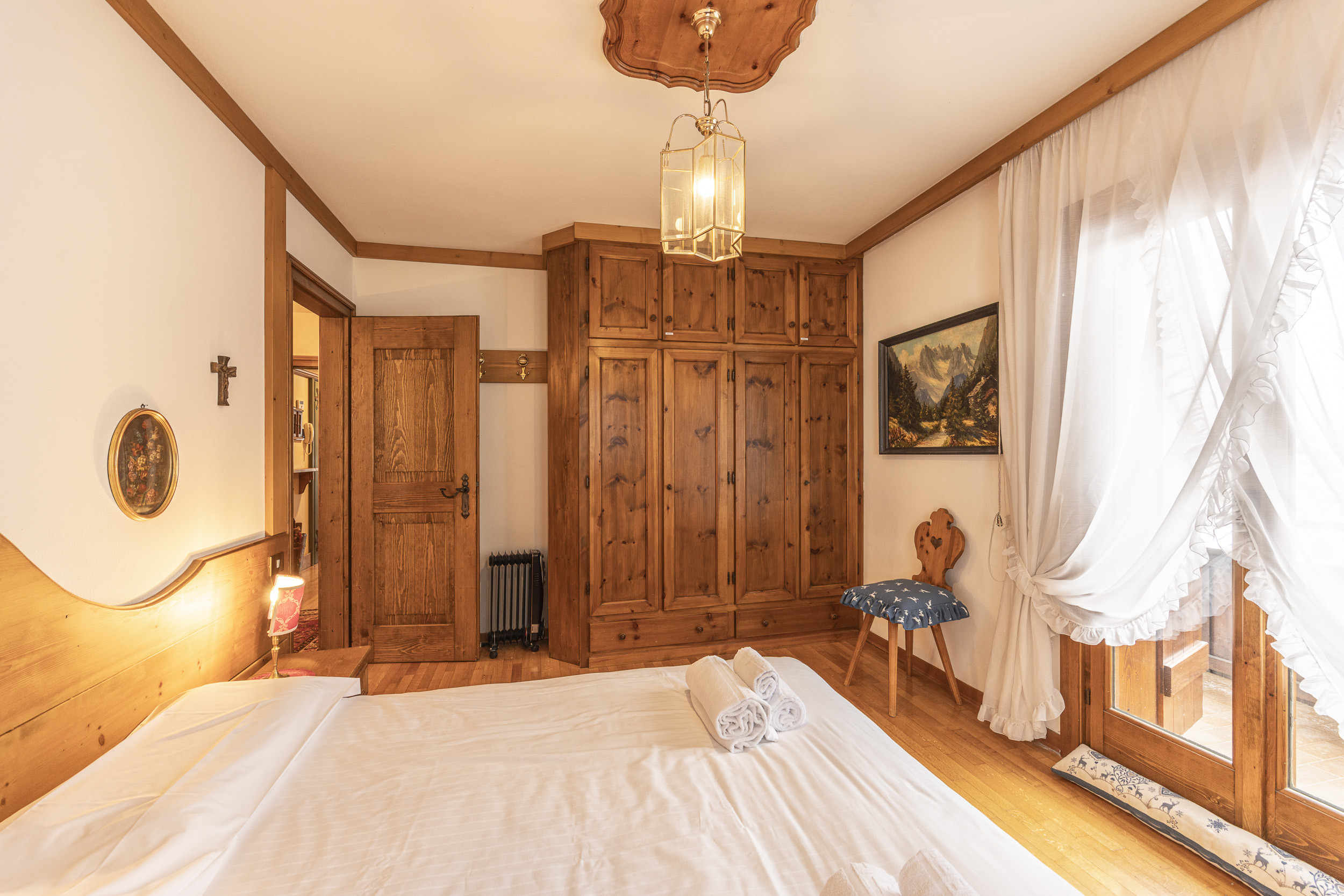 L’appartamento misura 55 mq e si trova al secondo piano. La zona giorno è composta da una sala da pranzo con grande tavolo e panca in legno e sedie di design. Il soggiorno è arredato con un comodo divano letto e una grande TV Lcd. Dal soggiorno si ha accesso al balcone dal quale si ha una vista spettacolare sulle Dolomiti. L’angolo cottura è piccolo, ma super accessoriato con ampio frigo e frizer, lavastoviglie, microonde e macchina del caffè nespresso. L’appartamento dispone di due camere da letto; una camera con letto matrimoniale e una cabina armadio che può diventare anche una piccola tana/libreria per bambini. La seconda camera ha due letti singoli a castello e dispone di armadio e scrivania. A disposizione un ampio bagno con box doccia e lavatrice. A completare l'offerta di questo bellissimo alloggio un posto auto esterno e un collegamento internet Wi-fi.