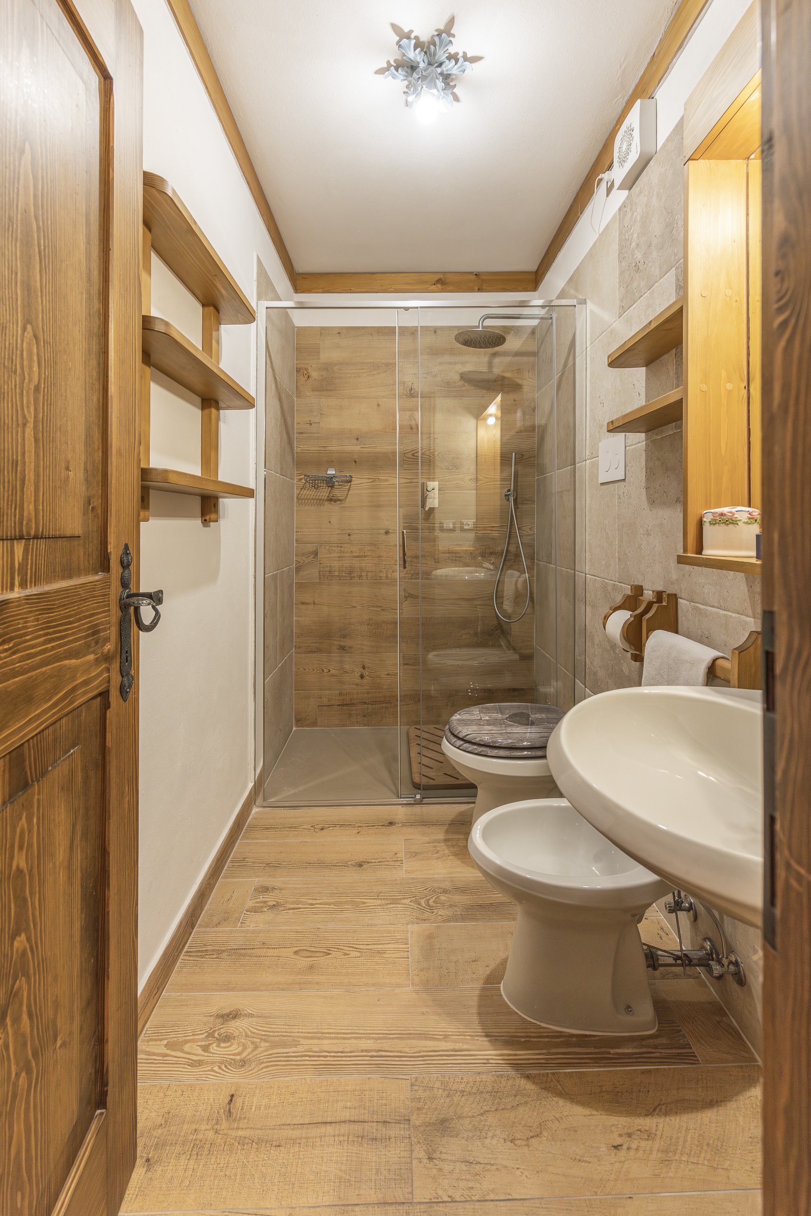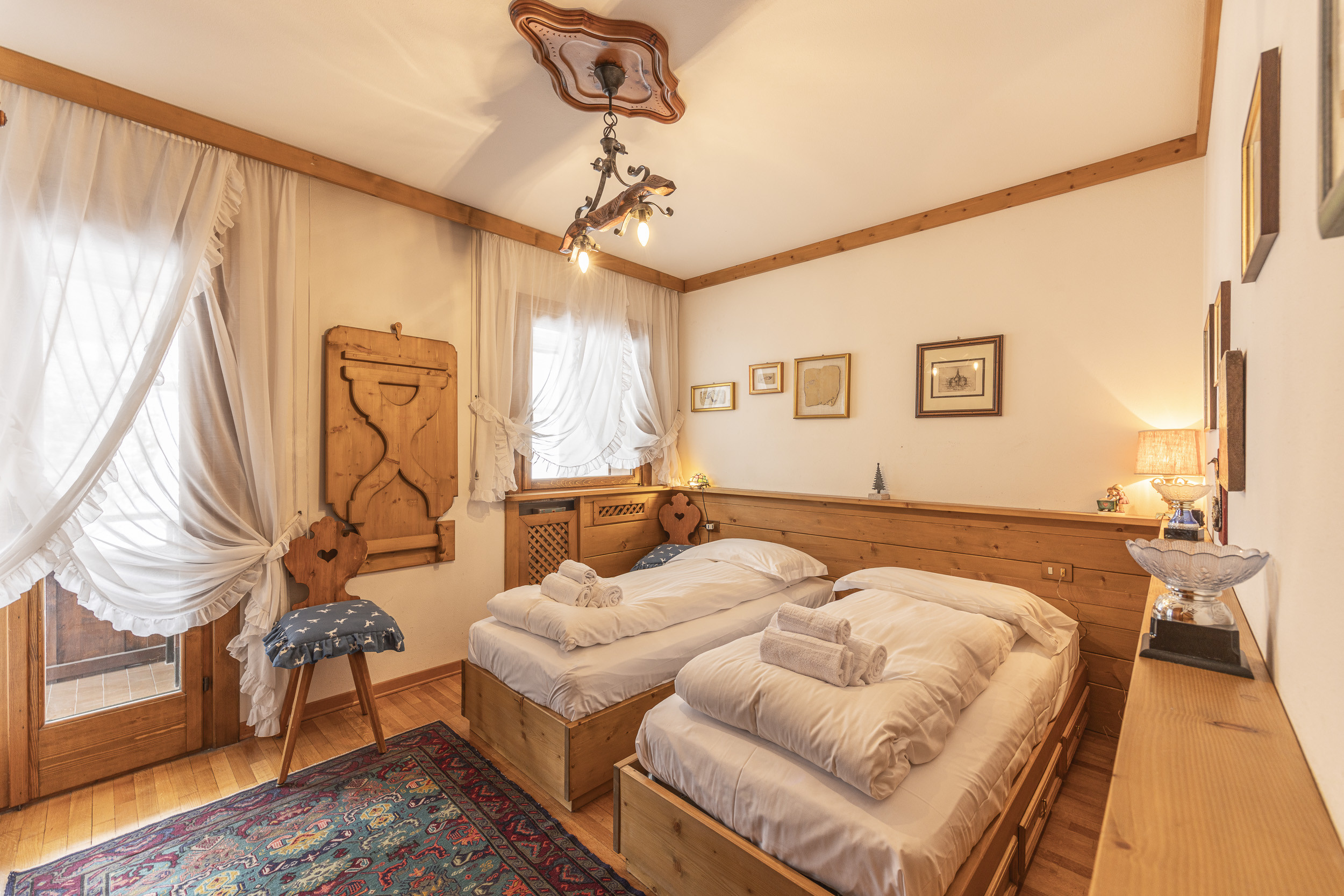 L’appartamento è arredato con cura nei dettagli, in stile rustico, completamente rivestito in legno. Dispone di due camere, due bagni e un comodo divano letto in soggiorno. Per la sua posizione e la capacità ad ospitare fino a 6 persone l’appartamento è ideale per una famiglia o un gruppo di amici che vogliono vivere una piacevole vacanza in montagna con la comodità di essere in pieno centro.