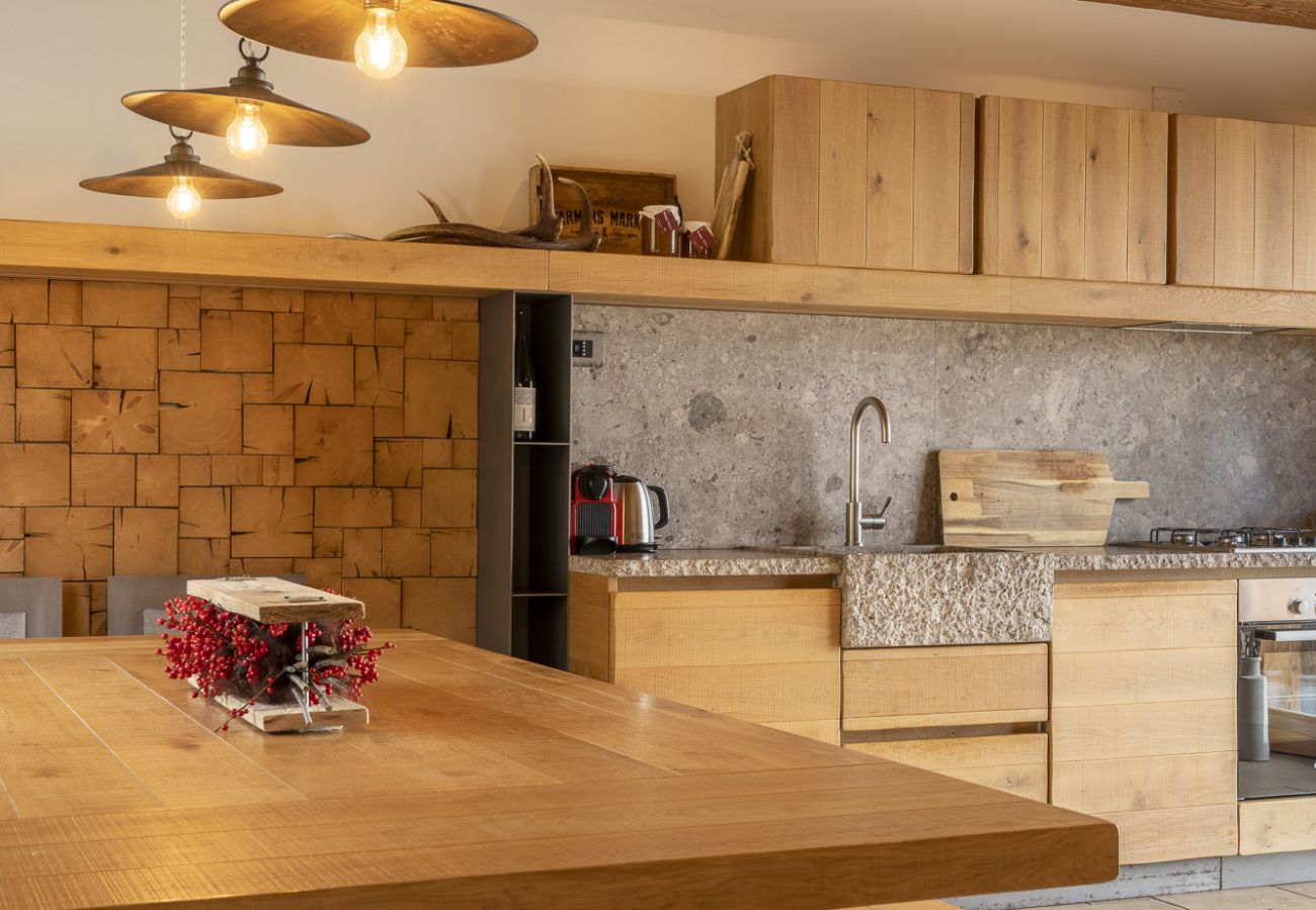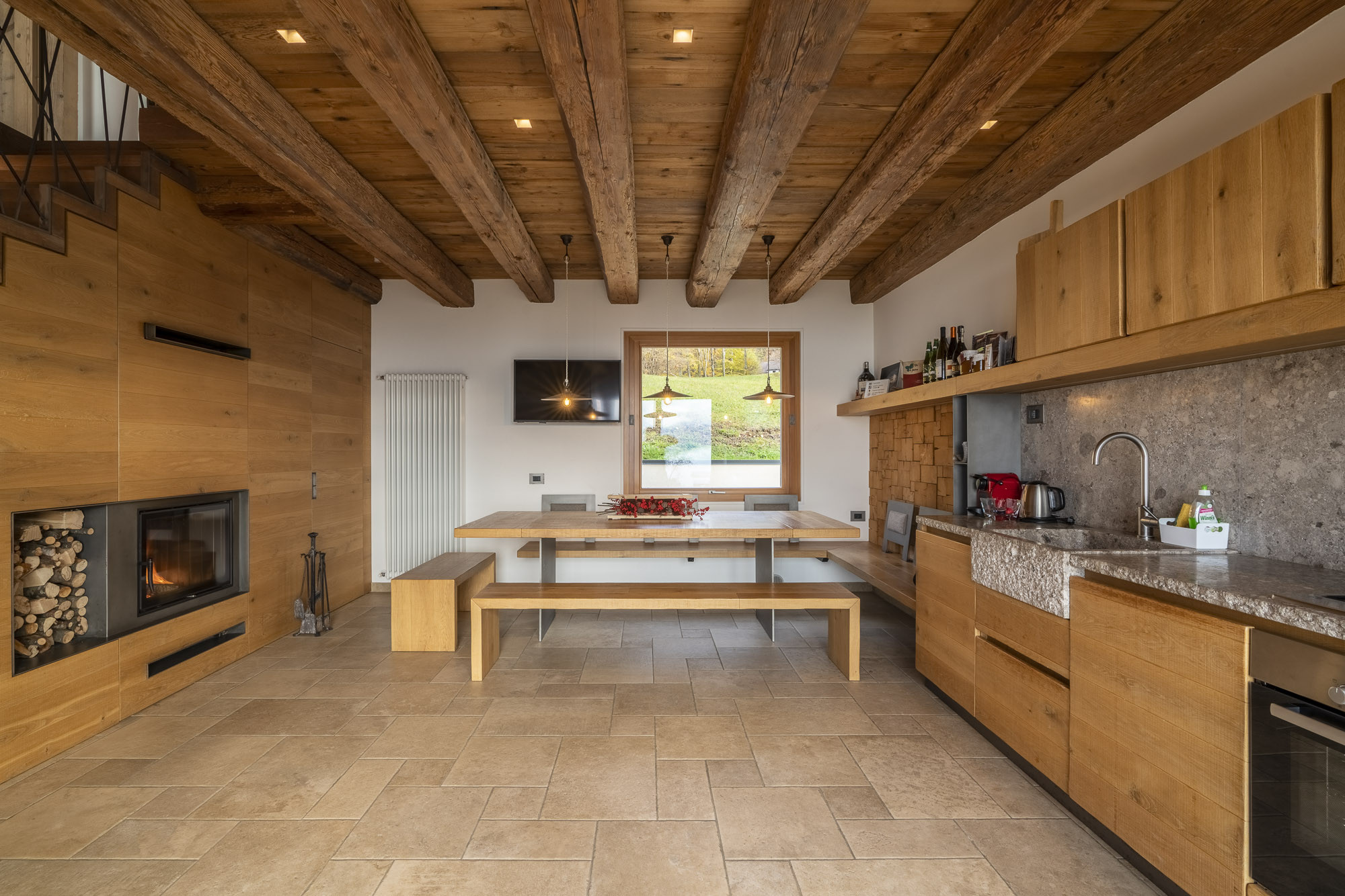 La cucina è fornita di ogni accessorio e permette di cucinare comodamente mentre ci si gode la splendida vista sulla valle.