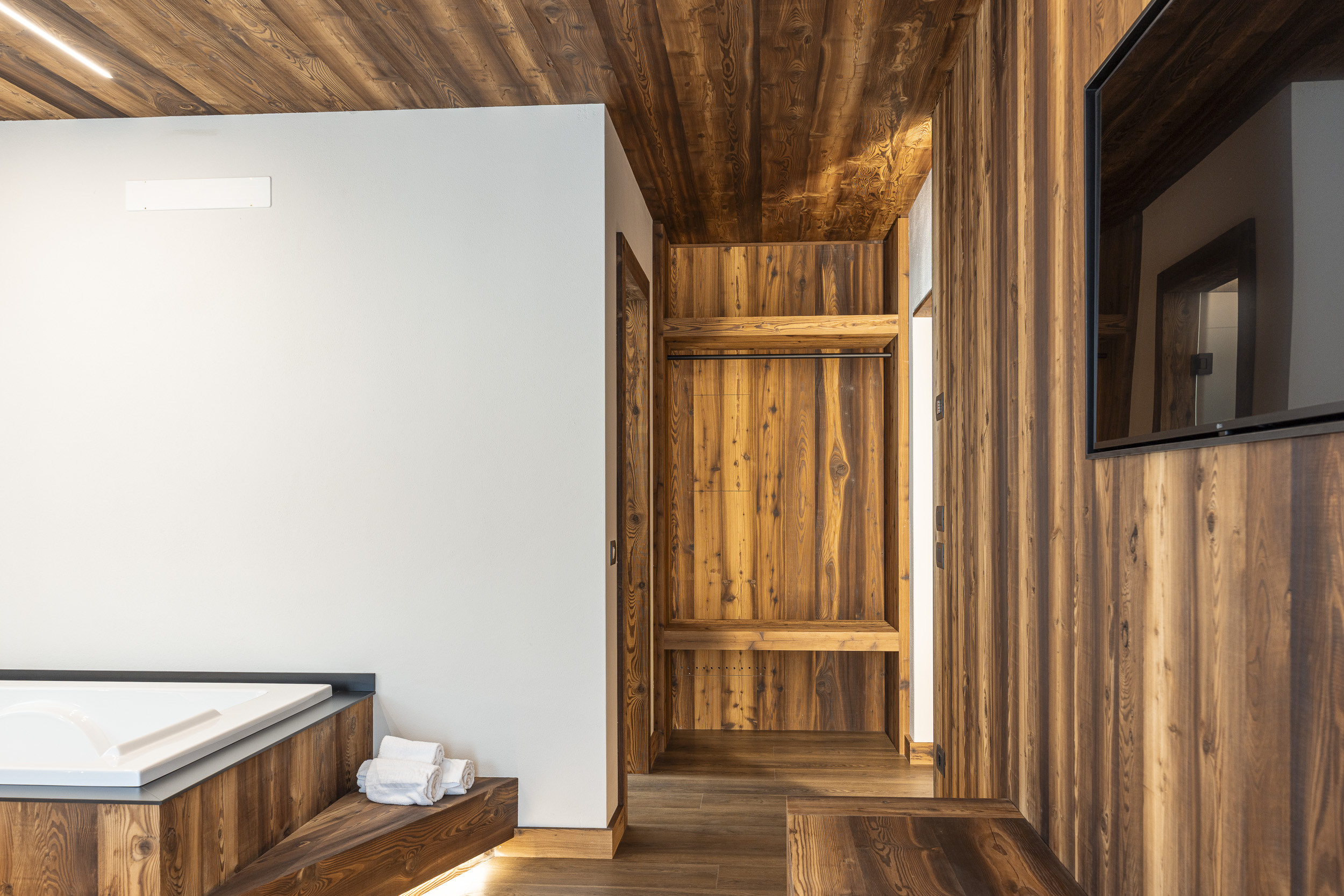 Die Dolomiten-Wohnung zeichnet sich durch ihren eleganten und zeitgenössischen Stil aus, der von natürlichen Materialien, sophistizierten Tönen und einer warmen, einladenden Atmosphäre geprägt ist. Sie verfügt über ein Schlafzimmer mit einem bequemen Queen-Size-Bett und einem raffinierten privaten Wellness-Bereich mit einer geräumigen Whirlpool-Badewanne und einer finnischen Sauna, die perfekt sind, um nach einem Tag voller Wanderungen oder Outdoor-Aktivitäten pure Entspannung zu genießen.