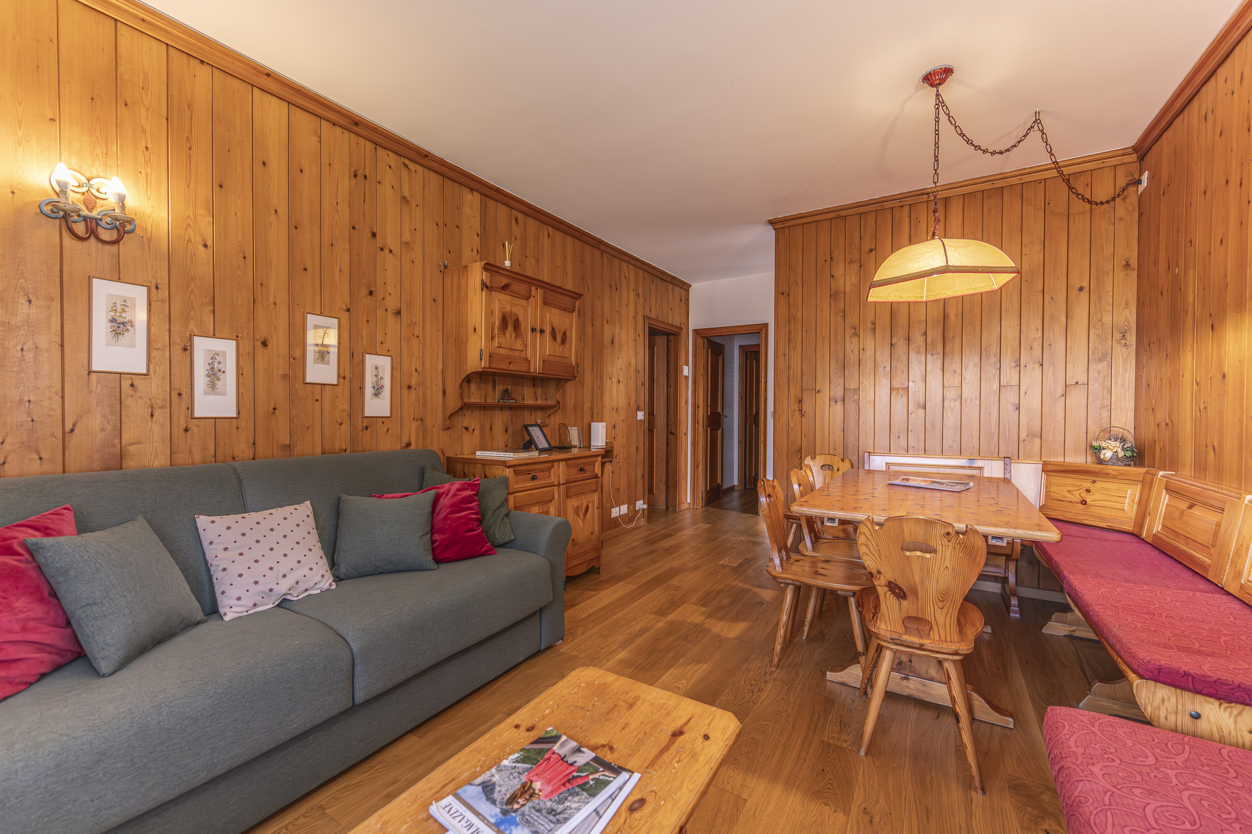 Die Wohnung hat eine Fläche von 55 qm und befindet sich im zweiten Stock. Der Wohnbereich besteht aus einem Esszimmer mit großem Holztisch und Bänken sowie Designstühlen. Das Wohnzimmer ist mit einem bequemen Schlafsofa und einem großen LCD-Fernseher ausgestattet. Vom Wohnzimmer aus hat man Zugang zum Balkon mit spektakulärem Blick auf die Dolomiten. Die Kochnische ist klein, aber sehr gut ausgestattet mit großem Kühl-/Gefrierschrank, Geschirrspüler, Mikrowelle und Nespresso-Kaffeemaschine. Die Wohnung verfügt über zwei Schlafzimmer; ein Schlafzimmer mit Doppelbett und ein Ankleideraum, der auch als kleine Leseecke/Kinderzimmer genutzt werden kann. Das zweite Schlafzimmer hat zwei Etagenbetten und verfügt über einen Kleiderschrank und einen Schreibtisch. Ein geräumiges Badezimmer mit Dusche und Waschmaschine runden das Angebot ab. Zusätzlich gibt es einen Außenparkplatz und eine WLAN-Verbindung.