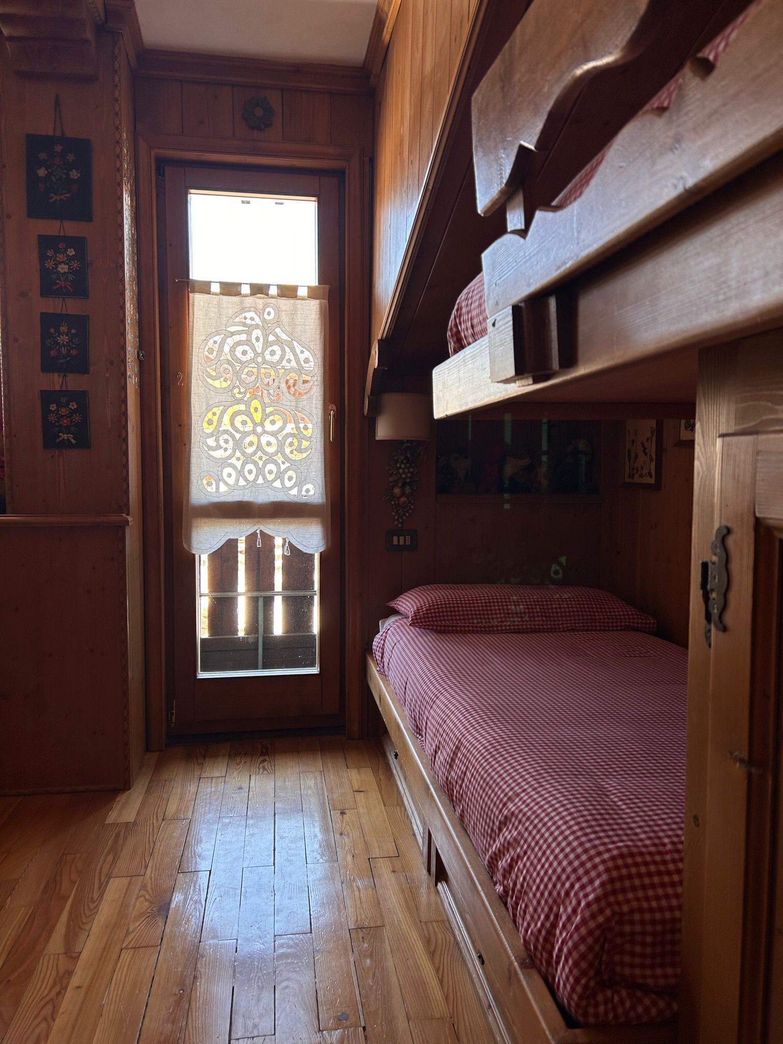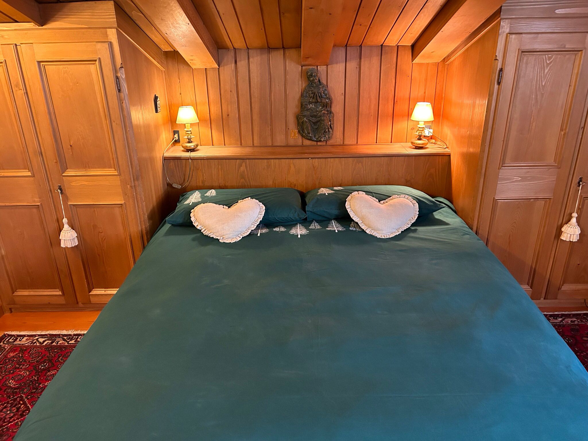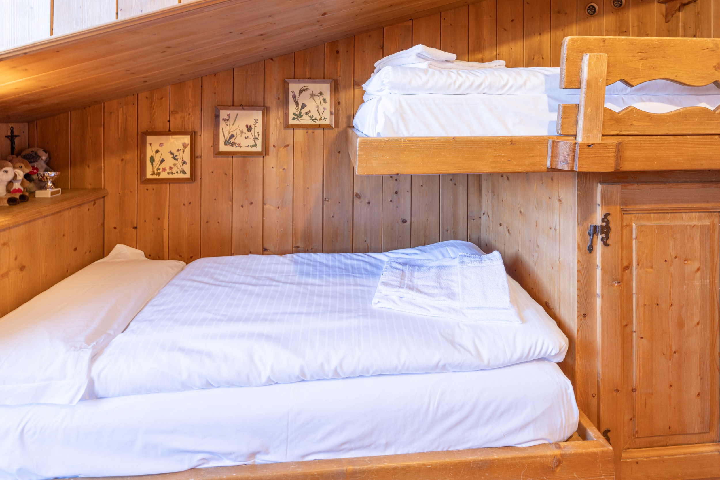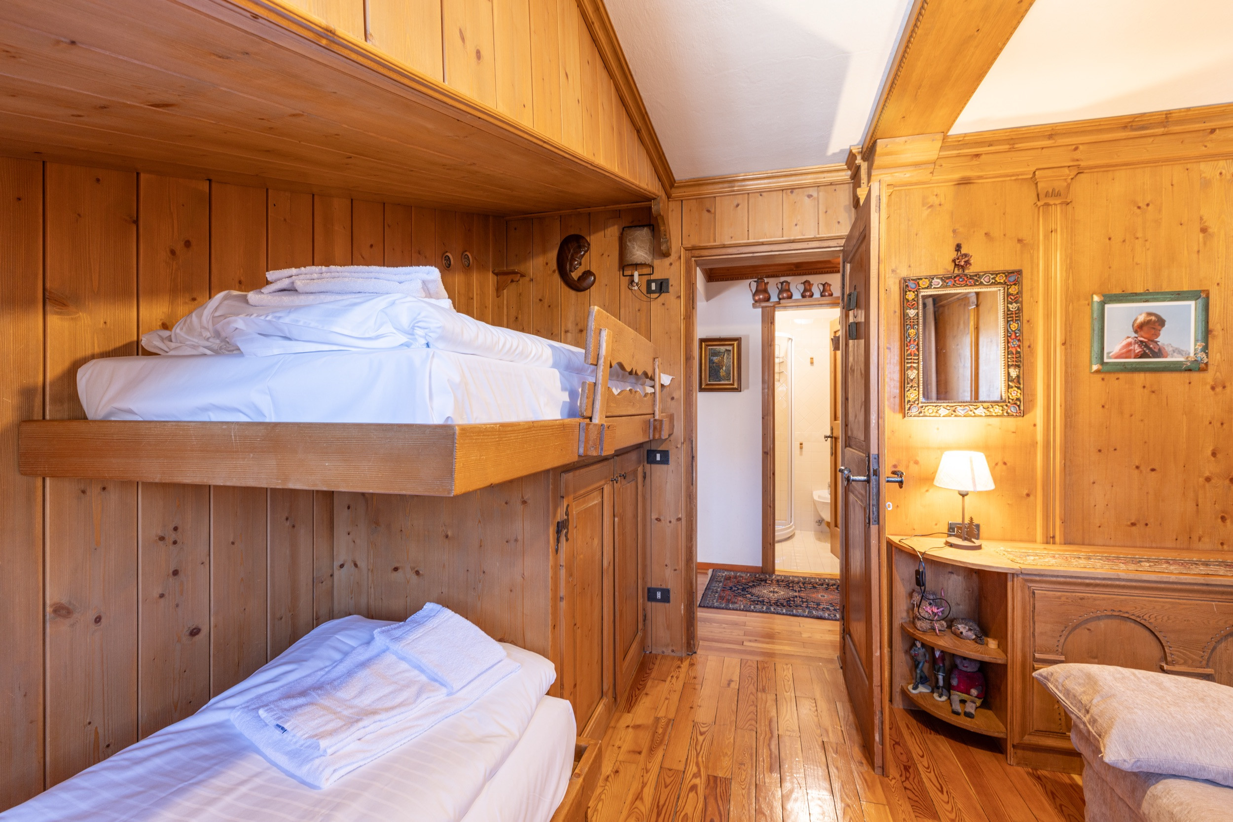 Die Schlafzone besteht aus einem Doppelzimmer mit eigenem Badezimmer, ausgestattet mit WC, Bidet und Duschkabine, sowie einem zweiten Zimmer mit Einzelbett und Stockbett. Es gibt auch ein zweites Badezimmer, ebenfalls mit WC, Bidet und Duschkabine.