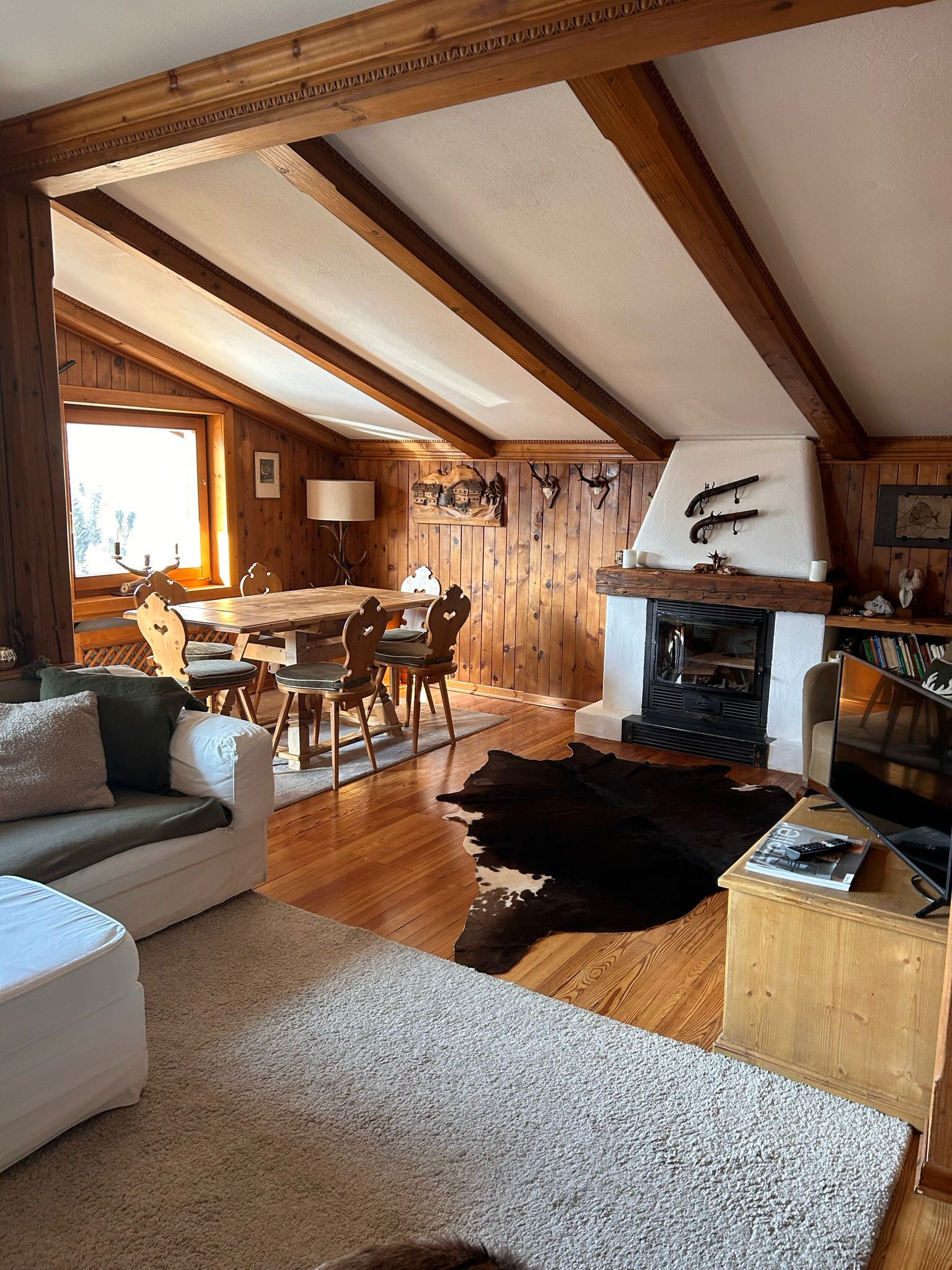 Die Wohnzone umfasst ein Wohnzimmer mit bequemem Sofa, Flachbild-TV und einem eleganten Esstisch mit Holzstühlen. Vom privaten Balkon aus kann man einen herrlichen Blick auf die umliegenden Berge genießen, ideal zum Entspannen in der Alpinlandschaft.