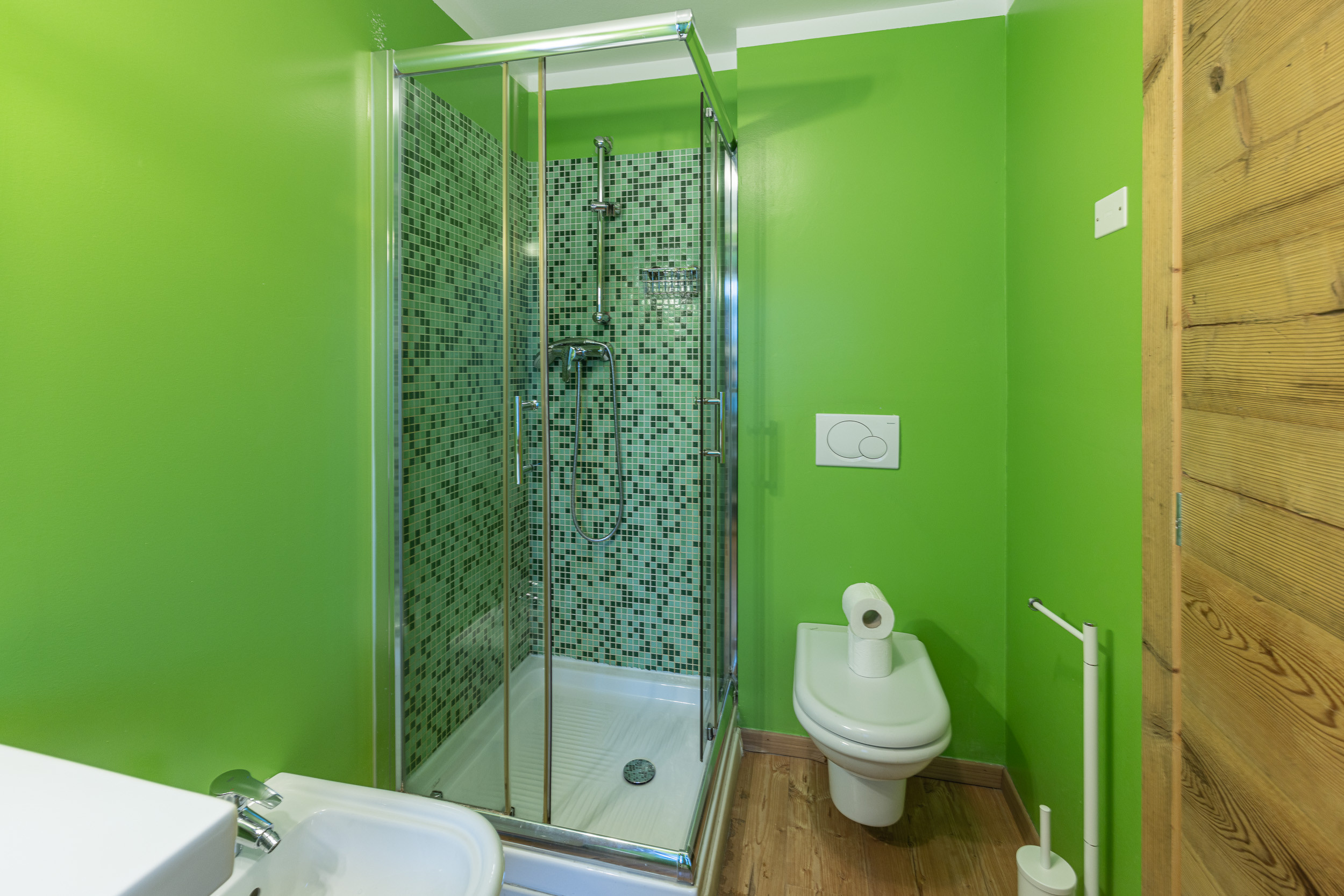 Die Wohnung besteht aus 4 bequemen und funktionalen Schlafzimmern. Ein Zimmer mit einem großen und bequemen Doppelbett und einem Schlafsofa, ein Zimmer mit zwei Einzelbetten, ein Zimmer mit einem Doppelbett, das eventuell geteilt werden kann, und einem dritten Einzelbett, und ein viertes Zimmer mit einem Doppelbett, das ebenfalls geteilt werden kann. Alle vier Schlafzimmer verfügen über einen LCD-Fernseher. Zur Verfügung stehen 3 Badezimmer mit WC, Bidet und Dusche, davon zwei en suite. Der Wohnbereich besteht aus einer Küchenzeile, ausgestattet mit Geschirrspüler, Mikrowelle und Kaffeemaschine, einem großen Holztisch, der insgesamt 11 Personen Platz bietet, und einem LCD-Fernseher mit Sky-Decoder. Ergänzt wird das Angebot dieser Wohnung durch eine Waschmaschine, einen WLAN-Anschluss und einen Außenparkplatz. Die Wohnung eignet sich hervorragend für eine große Familie oder eine große Gruppe von Freunden, die einen bequemen und ruhigen Ort für einen Urlaub in der Natur suchen.