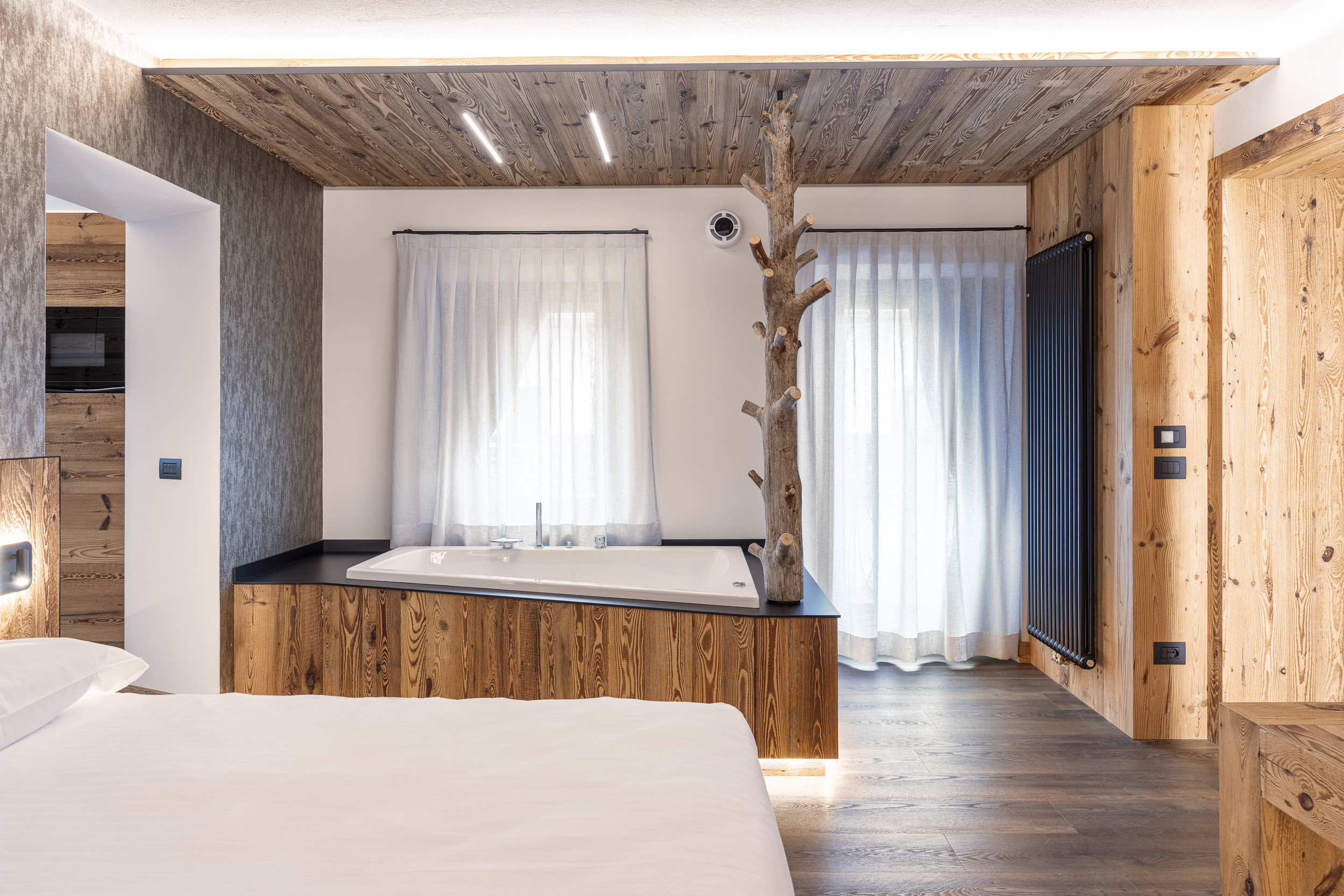 The Argento apartment stands out for its elegant and contemporary style, characterised by natural materials, sophisticated tones and a warm and welcoming atmosphere. It features a double bedroom with a comfortable queen-size bed and a refined private wellness area, equipped with a large hydromassage bathtub and Finnish sauna, perfect for enjoying moments of pure relaxation after a day spent on outdoor excursions or sports.