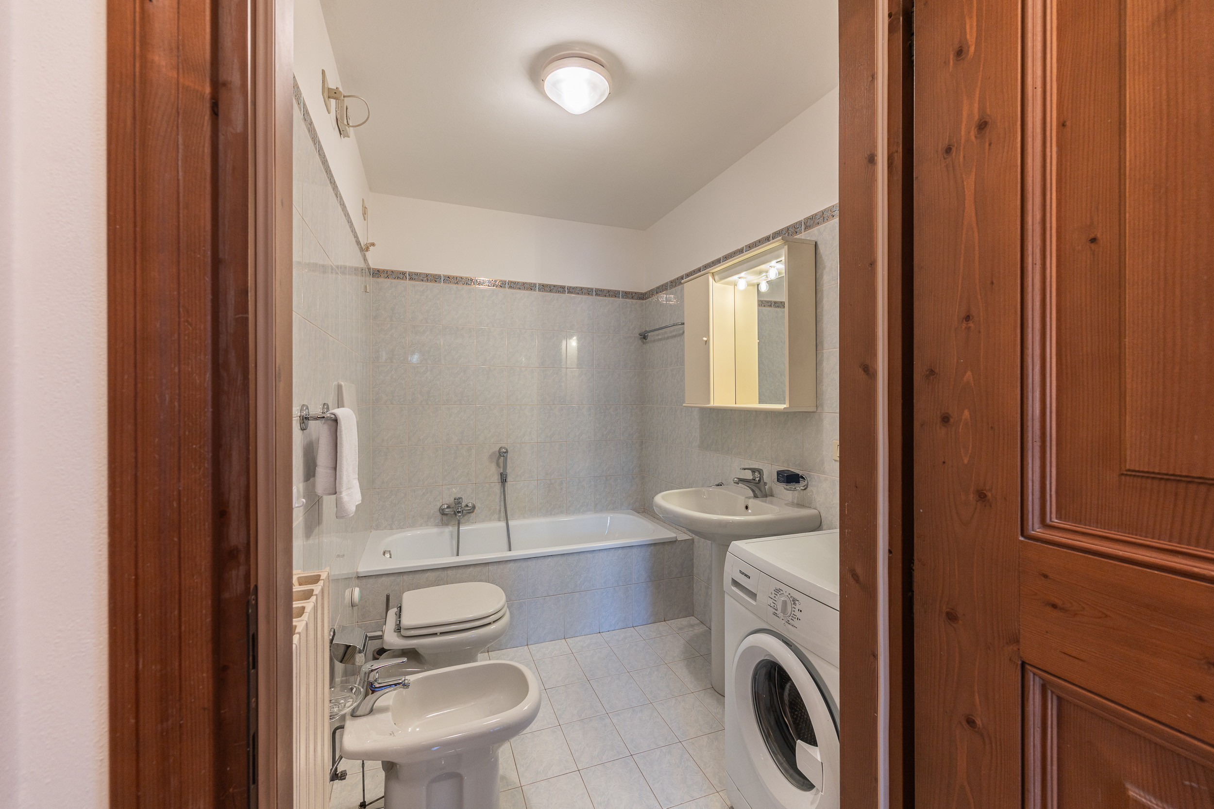 There are two bathrooms: one service bathroom with WC and washbasin, and the other complete with WC, bidet and bathtub.