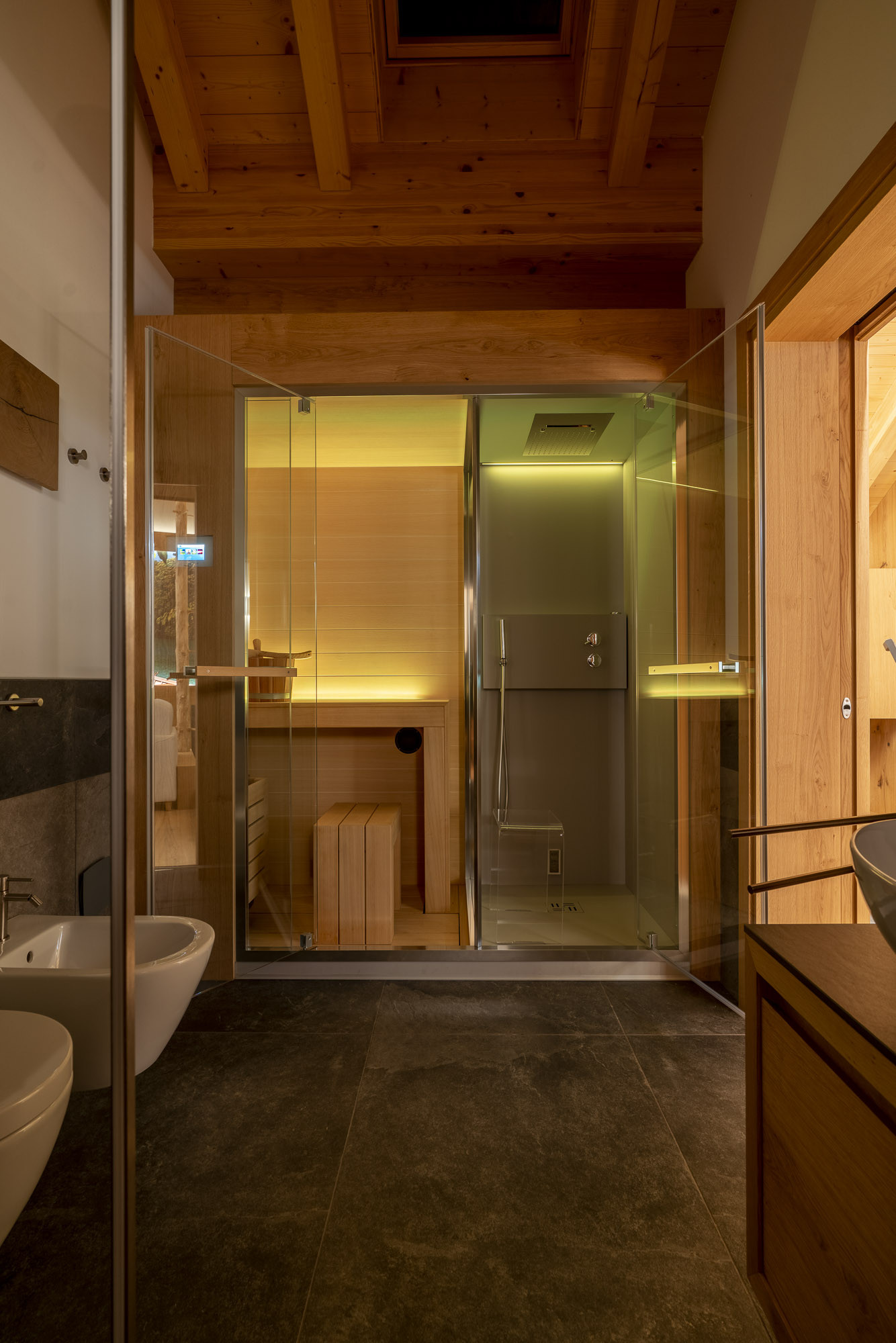 The sleeping area with panoramic views creates the atmosphere for unforgettable moments. The room is equipped with a luxurious double bed, an armchair that can turn into a single bed and a wellness area with Jacuzzi, sauna, Turkish bath and large shower with waterfall, nebulizers and infrared rays. The climate control with eco-friendly heat pump makes the habitability of the chalet even more comfortable.