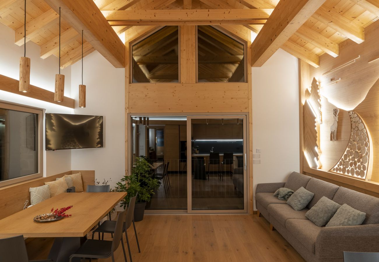 "Casera Cal de Mez - SoT" (equipped with automatic air exchange) is 85 square meters and consists of a large and panoramic living area on the ground floor. The kitchen is fully equipped with induction hob, oven, microwave, refrigerator and dishwasher. The dining area has a large table for pleasant convivial lunches and dinners. The living area has a comfortable sofa that can turn into a double bed if necessary. A smart TV and wi-fi connection are available. The exposed beams and the skillful use of wood and lights enhance the guest's experience.