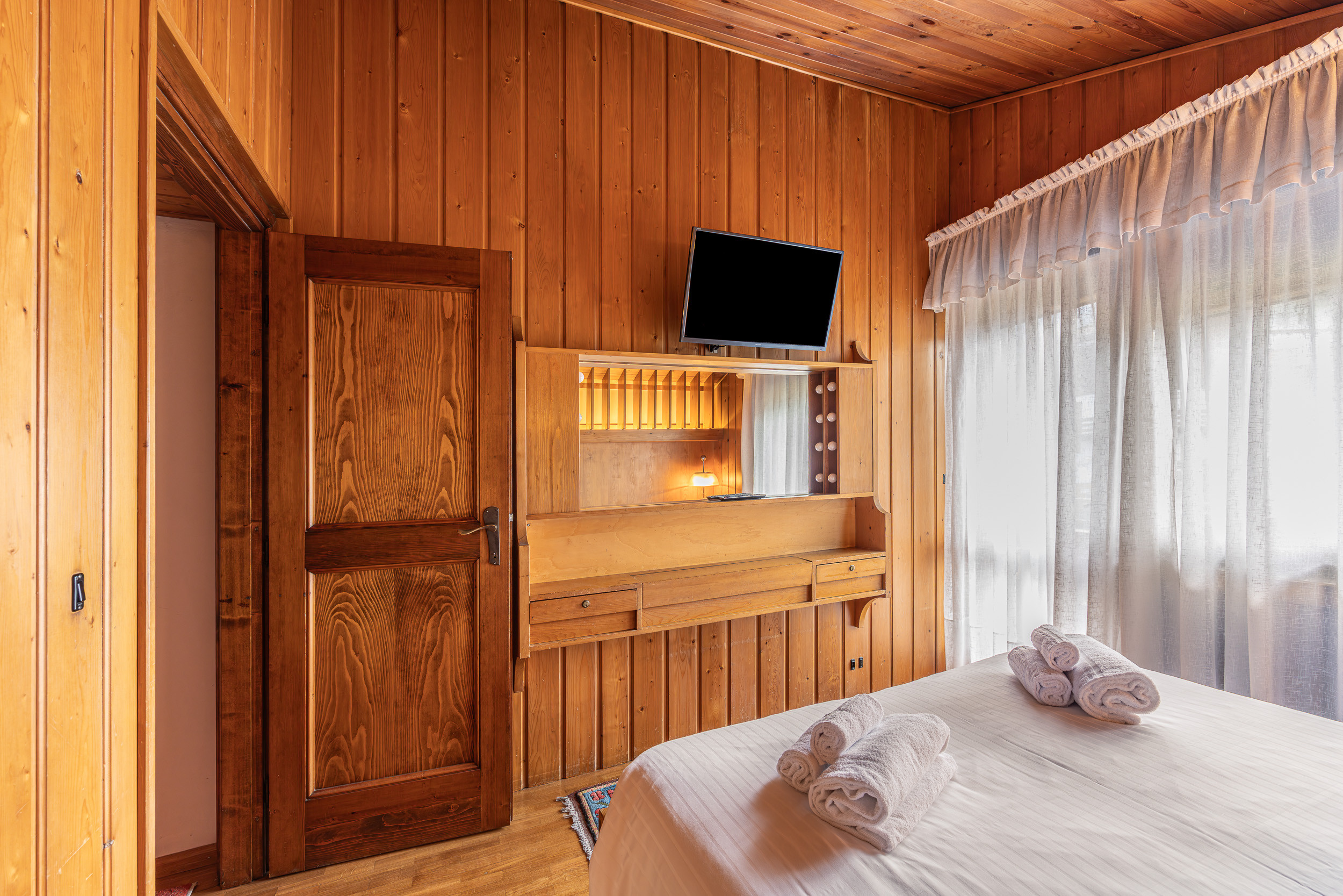 The apartment is carefully furnished in a rustic style, completely lined with wood. It has two bedrooms, two bathrooms and a comfortable sofa bed in the living room. Due to its location and the capacity to accommodate up to 6 people, the apartment is ideal for a family or a group of friends who want to enjoy a pleasant mountain holiday with the convenience of being in the town centre.
