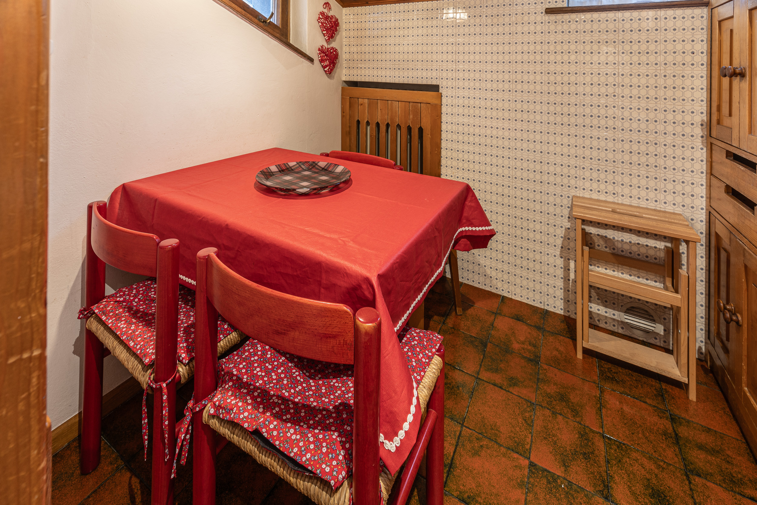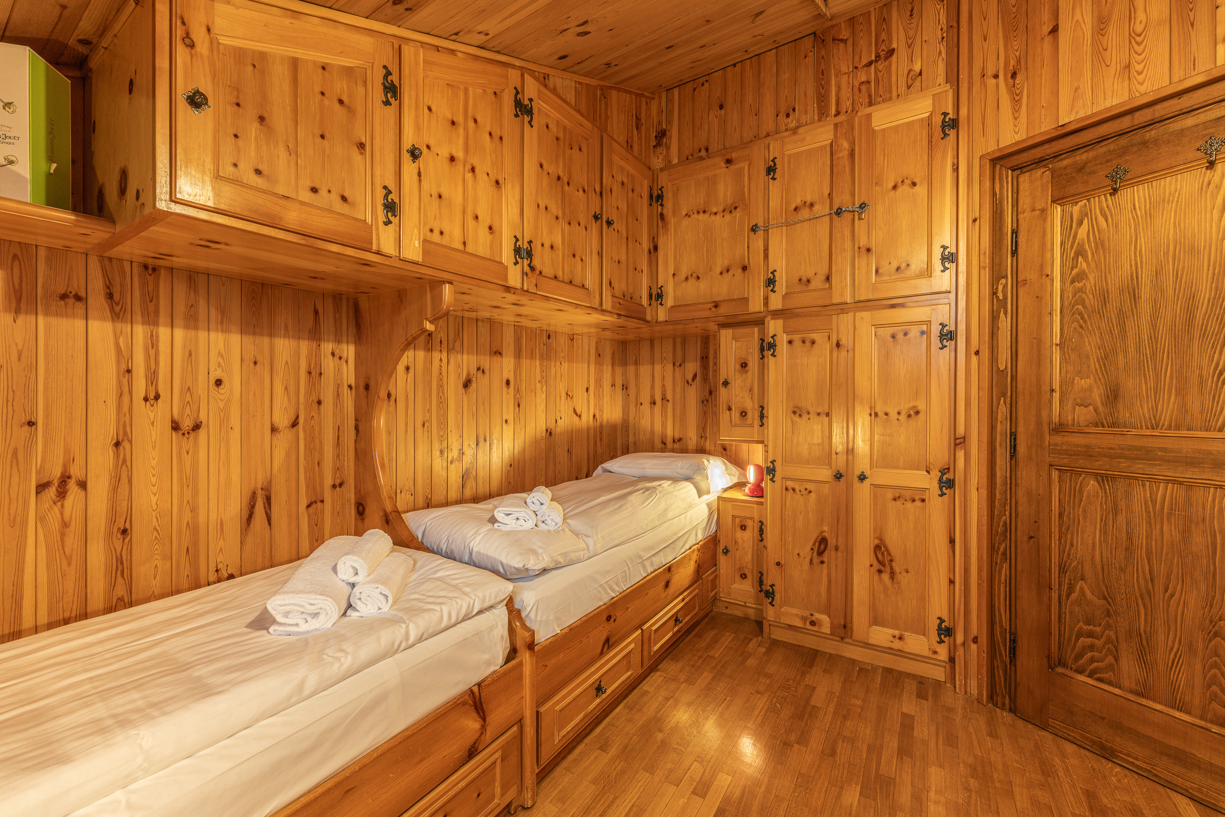 The apartment measures 55 sq m and is located on the second floor. The living area consists of a dining room with a large wooden table and bench and designer chairs. The living room is furnished with a comfortable sofa bed and a large LCD TV. From the living room you have access to the balcony, which offers a spectacular view of the Dolomites. The kitchenette is small but fully equipped with a large fridge and freezer, dishwasher, microwave and Nespresso coffee machine. The apartment has two bedrooms; one bedroom with a double bed and a walk-in wardrobe that can also become a small den/library for children. The second bedroom has two bunk beds and has a wardrobe and desk. There is a large bathroom with a shower cubicle and washing machine. To complete the offer of this beautiful accommodation, there is an outdoor parking space and a Wi-Fi internet connection.