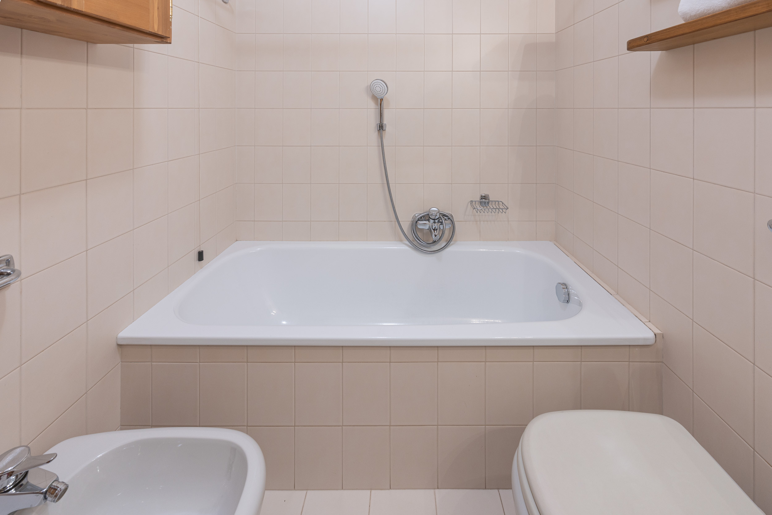 The bedroom has a comfortable double bed and a large wardrobe. The bathroom is equipped with a toilet, bidet and bathtub.