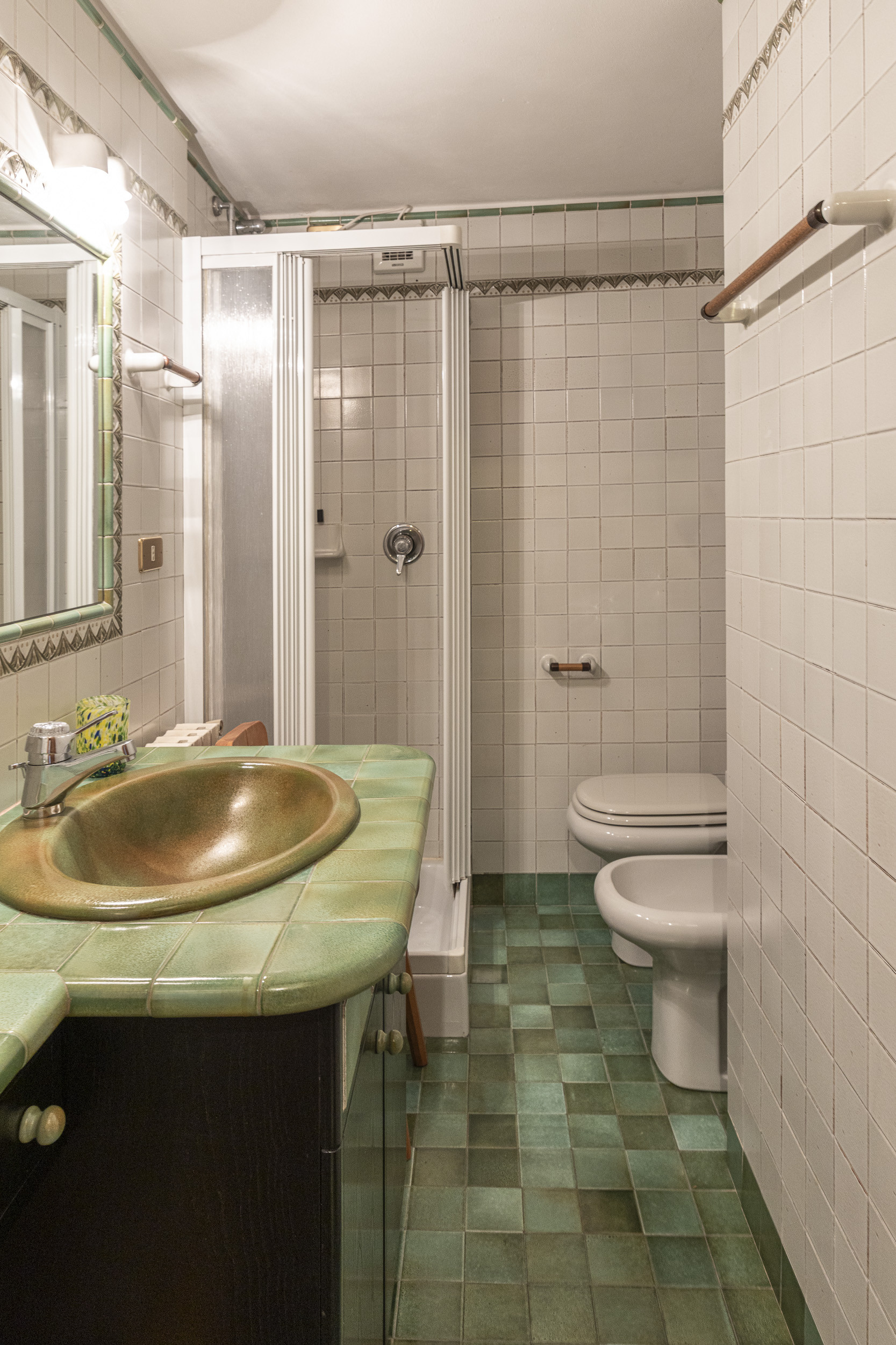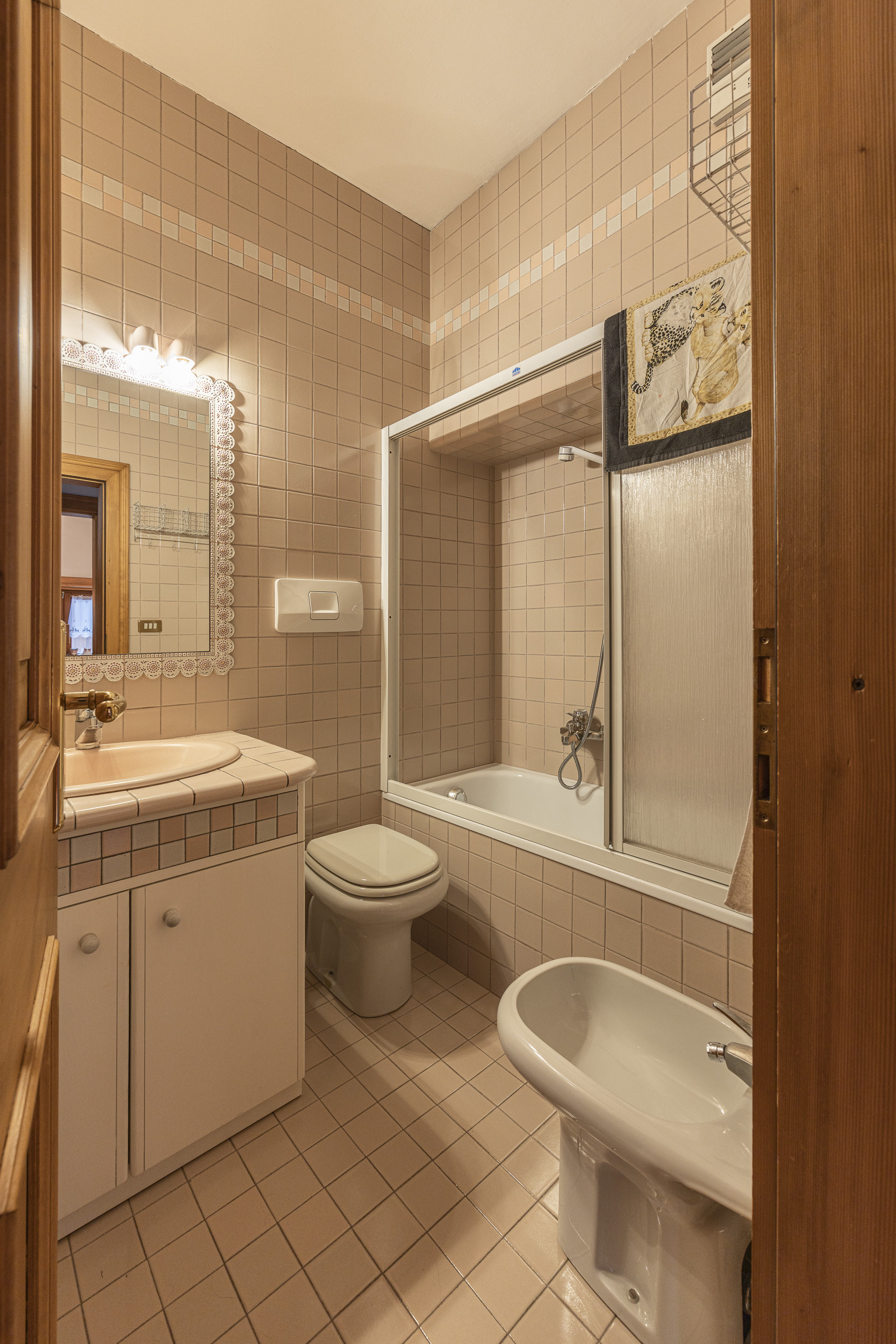 The bedroom has a comfortable double bed and a large wardrobe. The bathroom is equipped with a toilet, bidet and bathtub.