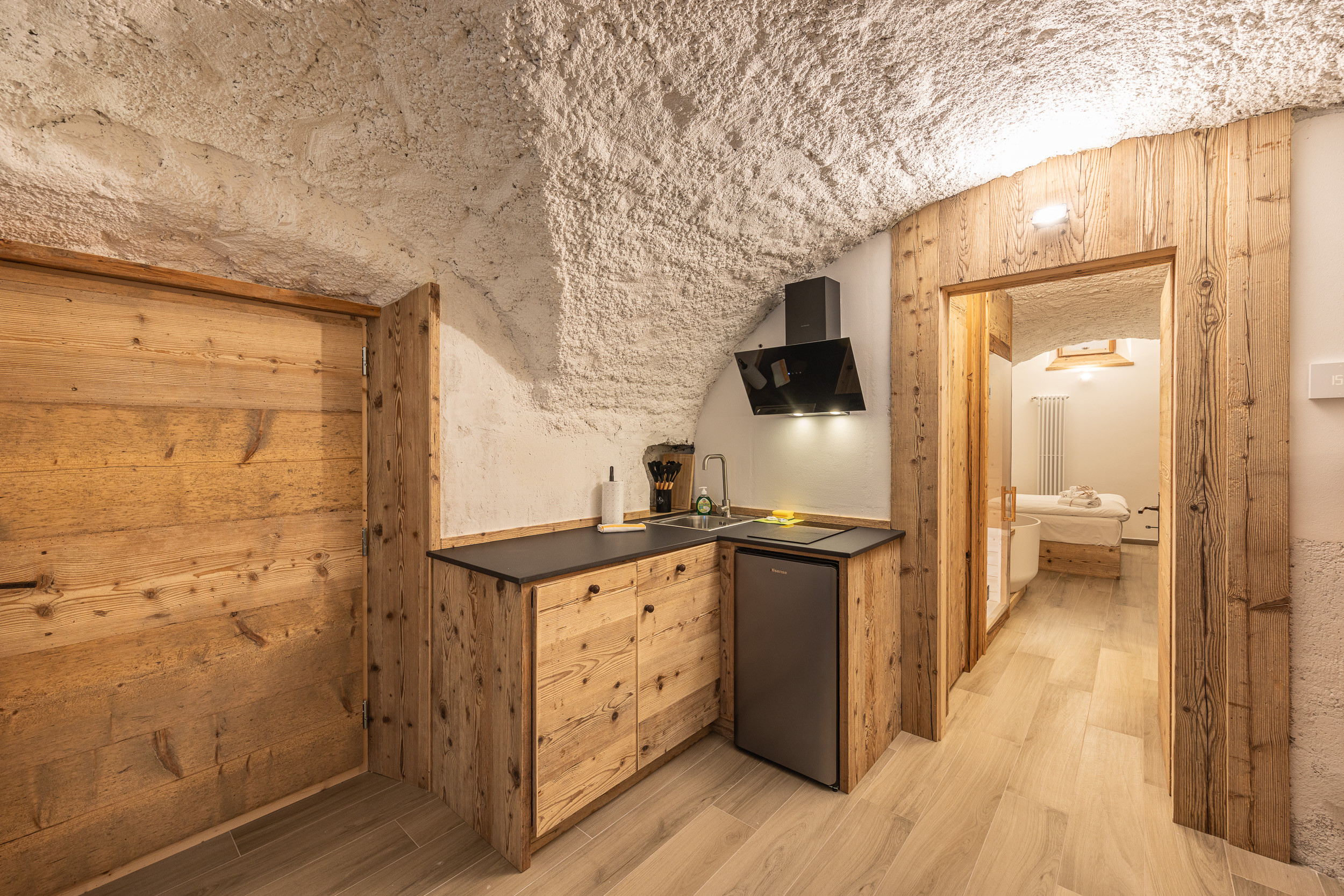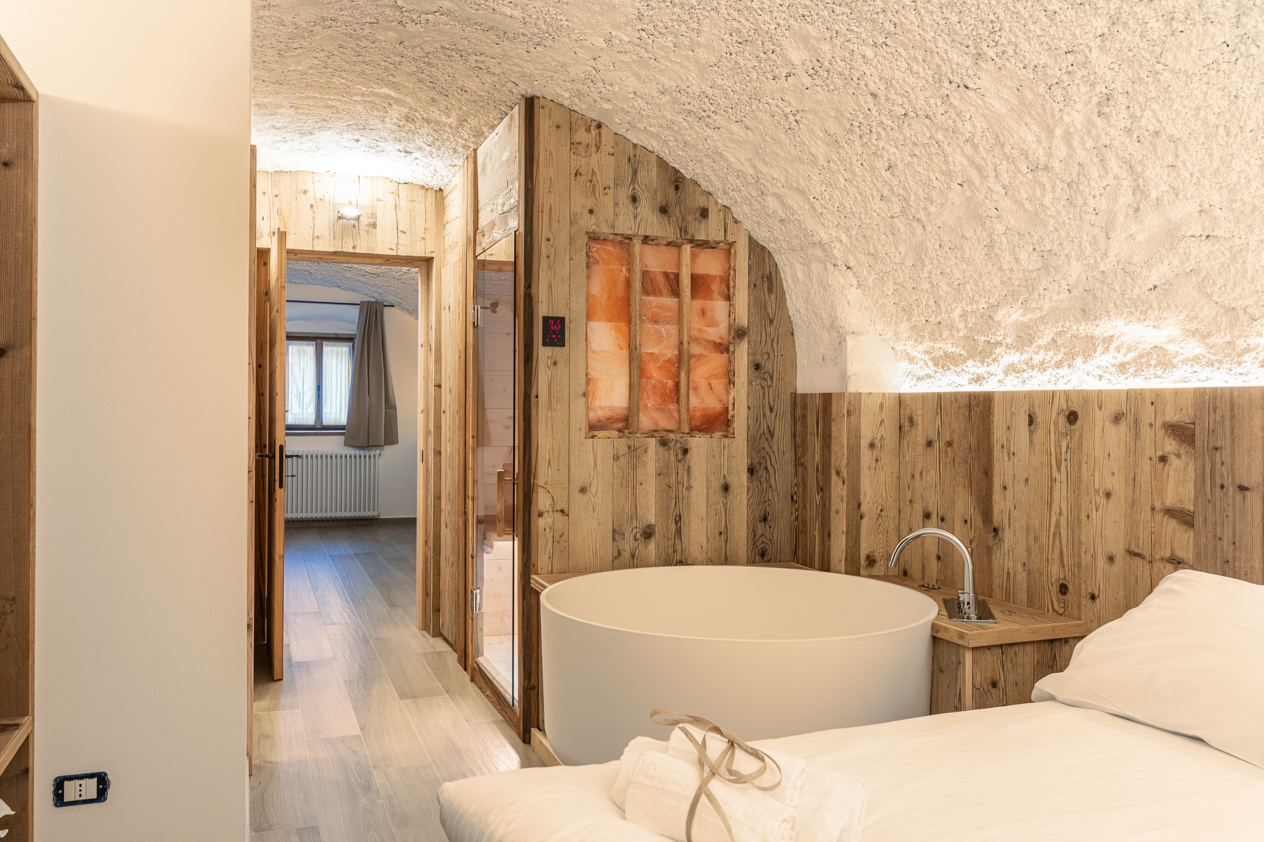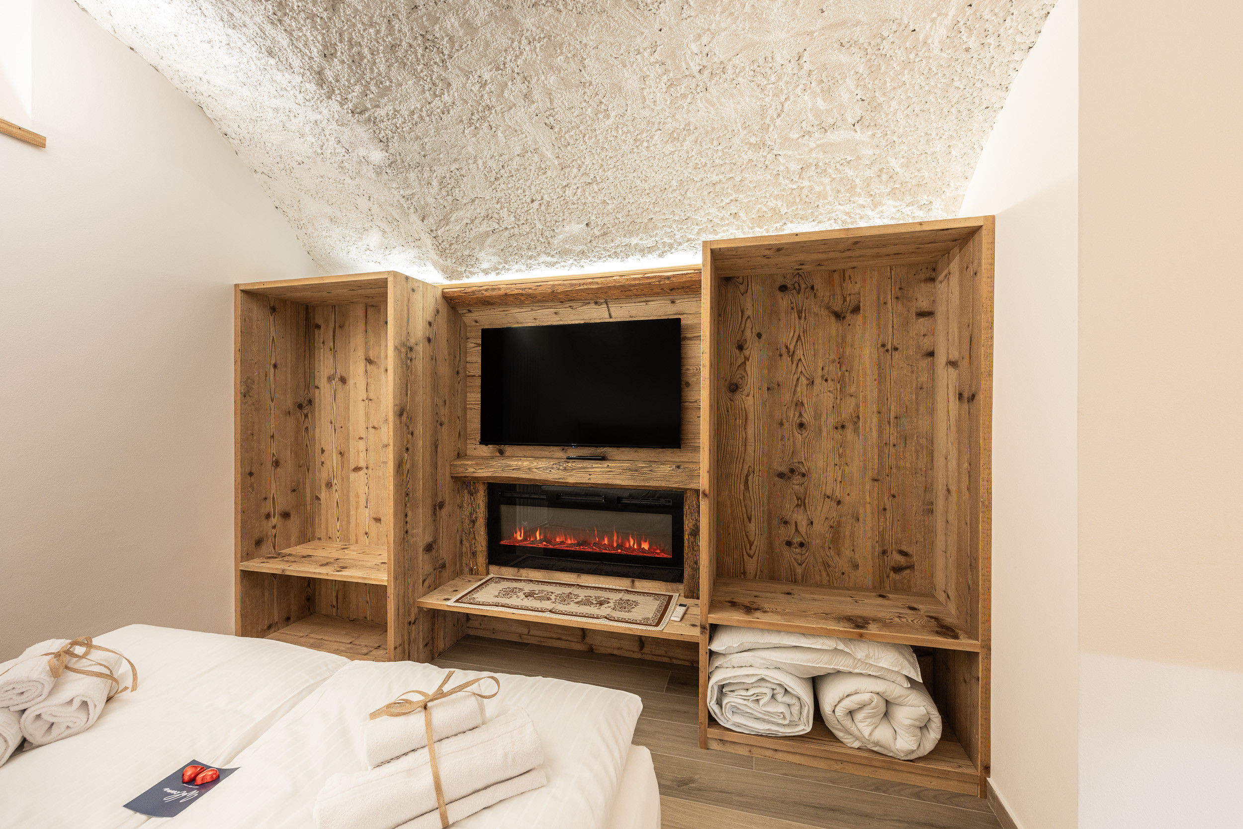 The apartment consists of a beautiful room with vaulted ceilings, furnished with a comfortable double bed, wardrobe, LCD TV and electric fireplace. Contributing to the unique environment are a round whirlpool bath and a splendid sauna, perfect for pleasant moments of well-being.