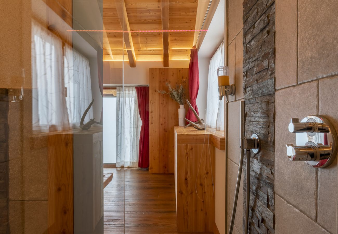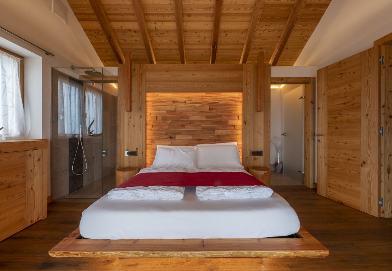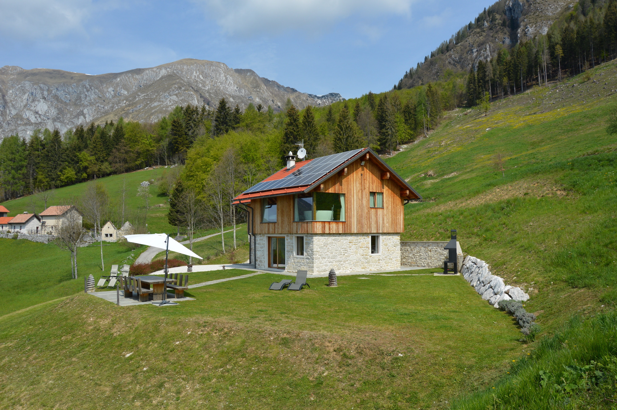 The “Casera” lodge consists of a large and bright living area with a fully equipped kitchen with stove, oven, fridge and dishwasher. The room has a large wooden table for convivial lunches or dinners, a beautiful fireplace and and a living area with a large and comfortable sofa and an LCD TV. On the ground floor there is a complete bathroom equipped with a washing machine. On the upper floor there are two beautiful bedrooms, very spacious and bright, each with a private bathroom with shower and the possibility of adding a third bed. One room has a large Jacuzzi right next to the double bed, comfortable for relaxing enjoying the spectacular panoramic view, thanks to the large window overlooking the valley. To complete and enrich the offer a large garden furnished with a wooden table and benches and a barbecue for enjoyable outdoor lunches.